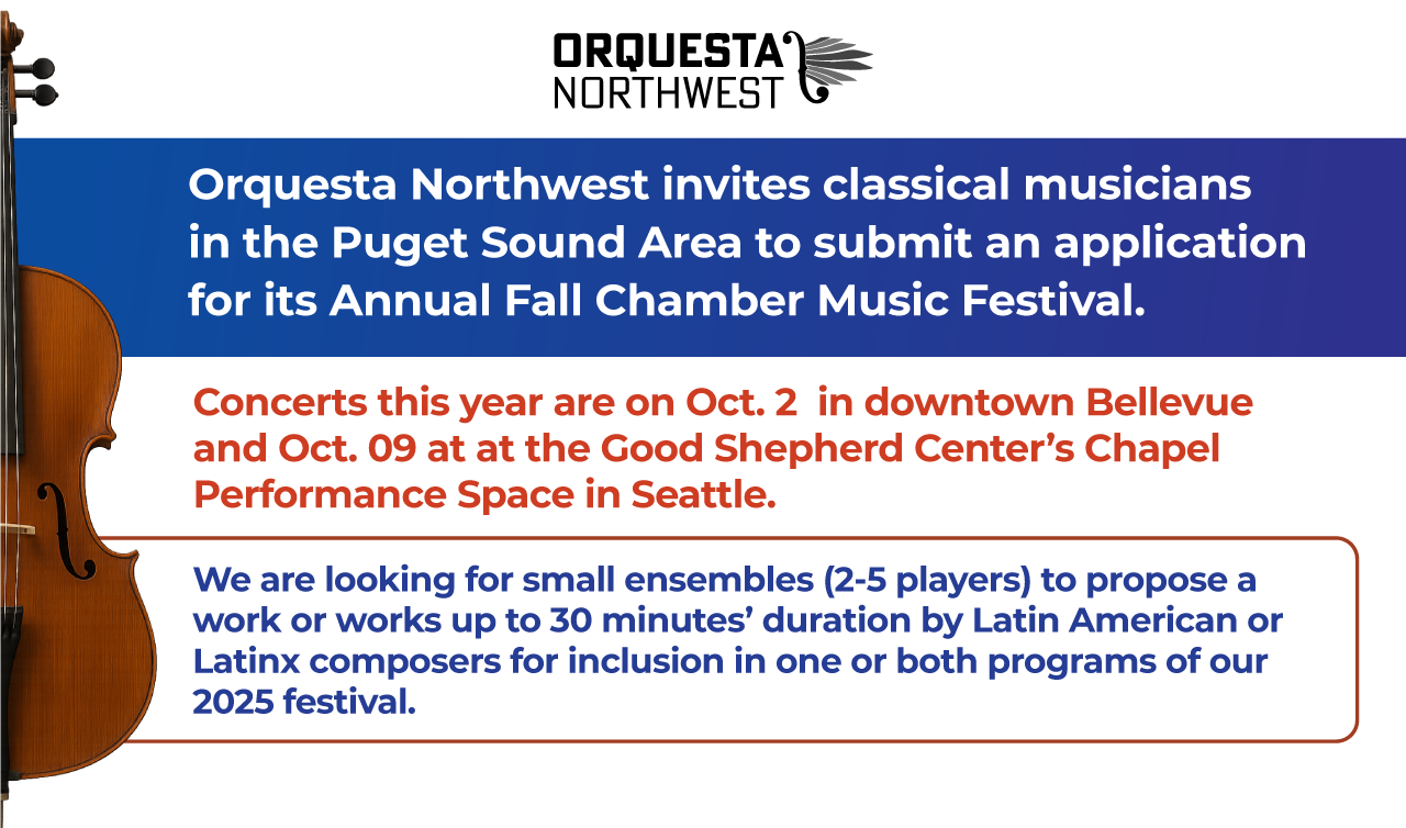 We are looking for small ensembles (2-5 players) to propose a work or works up to 30 minutes’ duration by Latin American or Latinx composers* for inclusion in one program of Orquesta NW’s Latino Chamber Music Festival 2025 on the evening of Oct. 2 in downtown Bellevue or Oct. 9 at the Good Shepherd Center’s Chapel Performance Space in Seattle. Participants should be able and willing to engage with the audience by verbally sharing some meaningful information about the music and composers with them at the performance.